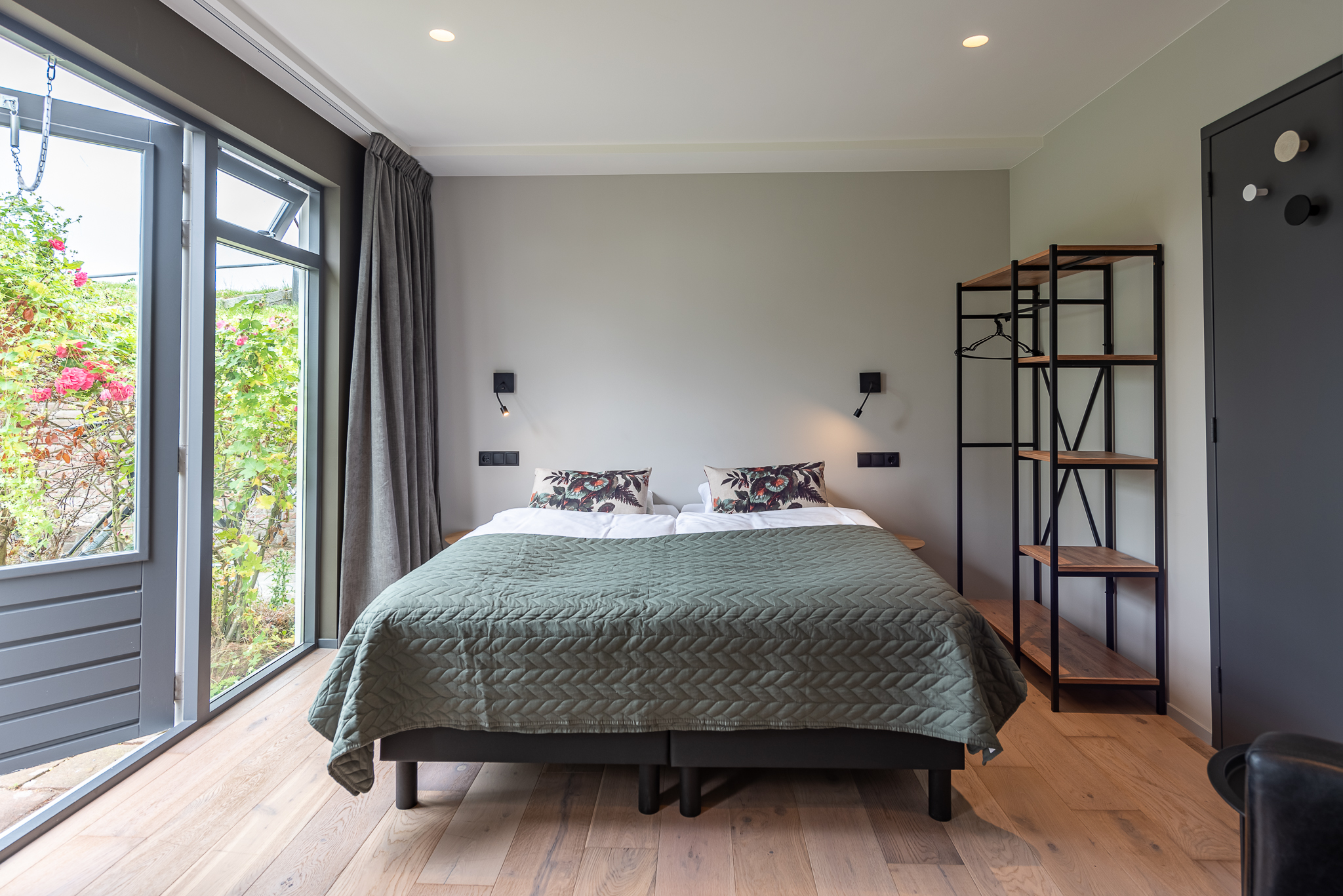 De kamer heeft een openslaande tuindeur naar het terras. Dit is een ideale plek voor gasten die de hond meenemen of die slecht ter been zijn.